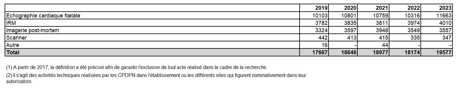 Concernant les actes techniques (Tableau CPDPN17), 15 400 prélèvements à visée diagnostique ou pronostique ont été réalisés, et 1 503 gestes à visée thérapeutique.