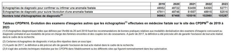 Tableau CPDPN16. Evolution des examens d'imageries autres que les échographies(1) effectuées en médecine fœtale sur le site des CPDPN(2) de 2019 à 2023