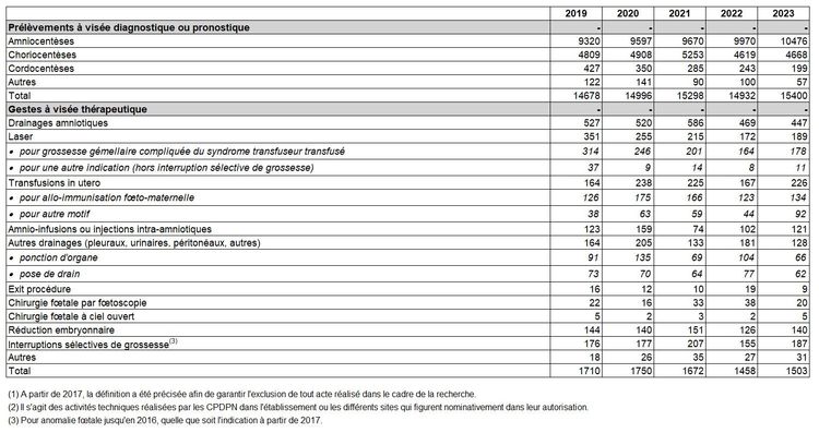 La tendance des prélèvements fœtaux à visée diagnostique ou pronostique en est revenue à l’augmentation en 2023 après une diminution passagère en 2022. Le nombre total des gestes à visée thérapeutique est en augmentation avec 1 503 actes (1 458 en 2022),