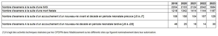 Tableau CPDPN18. Evolution du nombre d'examens fœtopathologiques réalisés sur le site du CPDPN(1) pour des fœtus dont le dossier a été examiné par le CPDPN de 2019 à 2023