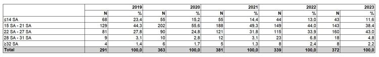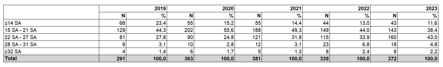 Tableau CPDPN12. Attestations de particulière gravité délivrées pour motif maternel : évolution de la répartition des âges gestationnels au moment de la délivrance de l'attestation de 2019 à 2023