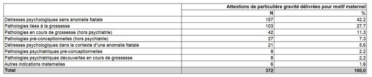 En 2023, 372 attestations de particulière gravité autorisant l’IMG pour motif maternel ont été déclarées (Tableau CPDPN1). Cette information pourrait ne pas être collectée de manière exhaustive dans la mesure où ces décisions ne sont pas toujours prises dans le cadre d’un CPDPN. Elles sont délivrées par une équipe comprenant « au moins un médecin qualifié en gynécologie-obstétrique, membre d'un centre pluridisciplinaire de diagnostic prénatal, un praticien spécialiste de l'affection dont la femme est atteinte, un médecin ou une sage-femme choisis par la femme et une personne qualifiée, tenue au secret professionnel, qui peut être un assistant social ou un psychologue[1]. Néanmoins, l’arrêté de bonnes pratiques[2] précise que la décision doit être transmise au CPDPN. Le manque d’exhaustivité peut également être lié aux situations d’urgence obstétricale pour lesquelles le pronostic vital de la femme est en jeu.