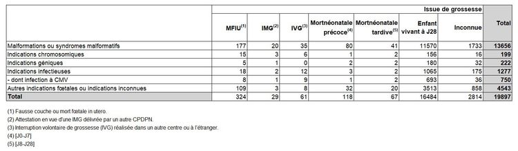 Dans 68,6 % des cas (13 656/19 897), la pathologie fœtale prise en charge est malformative. Les autres indications sont secondaires à un diagnostic fœtal d’anomalie chromosomique (1 %), génique (1,2 %) ou de pathologie infectieuse (6,4 %), soit au total 8,5 % des dossiers (1 698 / 19 897) (Tableau CPDPN2). Plus particulièrement, l’infection à CMV (cytomégalovirus) représente plus de la moitié (58,7 %) des indications infectieuses. A noter que l’information quant à la pathologie fœtale est manquante ou non précisée dans 22,8 % des cas (4 543 / 19 897) (Tableau CPDPN2). Ces chiffres sont stables. Un travail devra être mené avec les CPDPN pour améliorer la qualité de cette information.