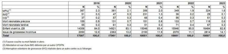 Les données concernant les issues de grossesse montrent qu’un tiers (52/156) des nouveau-nés sont vivants à J28 et 28,2 % (44/156) de ces grossesses sont interrompues, soit dans le cadre d’une IVG réalisée dans un autre centre ou à l’étranger (n=34), soit d’une IMG après attestation délivrée par un autre CPDPN (n=10) (Tableau CPDPN4). Il y a une mort fœtale in utero dans 5,7 % (9/156) et un décès néonatal dans 2,6 % (4/156). L’issue de grossesse demeure inconnue pour 27 cas, soit 17,3 %.