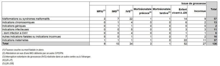 La majorité des situations concernées sont en lien avec une situation fœtale de « malformation ou syndrome malformatif » (41,9 % ; 57 / 136), et une « indication maternelle » (27,2 % ; 37 / 136).