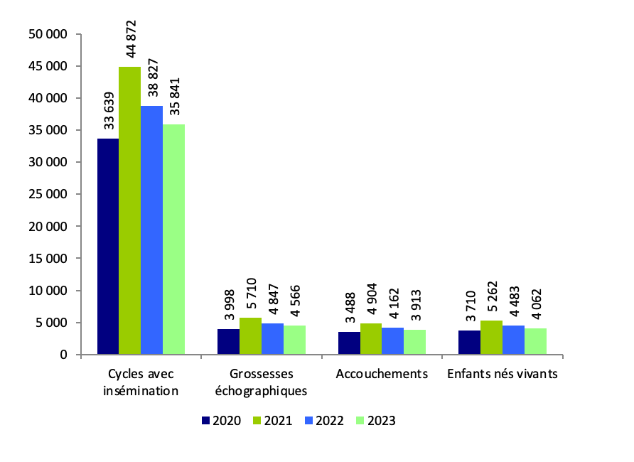 Figure AMP21. Inséminations artificielles intra-utérines avec les spermatozoïdes du conjoint : inséminations, grossesses, accouchements et enfants nés vivants de 2020 à 2023