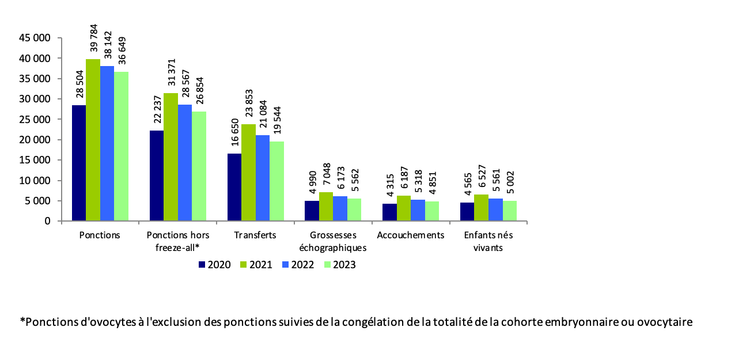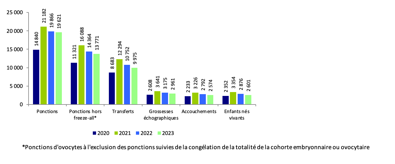 Figure AMP22. FIV hors ICSI avec ovocytes et spermatozoïdes du couple : ponctions, transferts, grossesses, accouchements et enfants nés vivants de 2020 à 2023