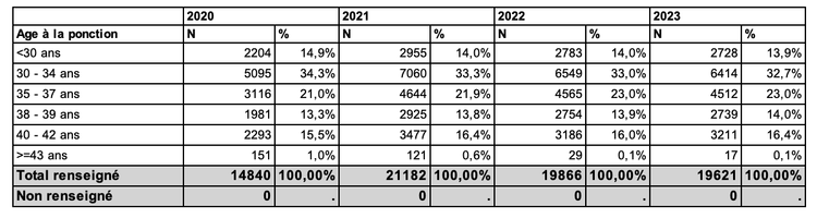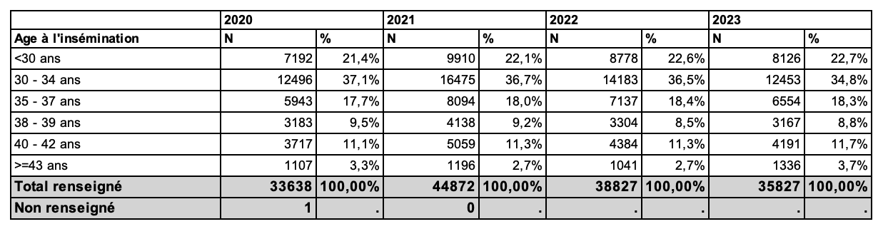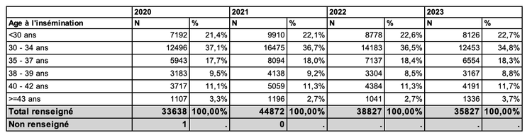 Tableau AMP8. Insémination intra-utérine avec les spermatozoïdes du conjoint : répartition de l'âge des femmes à l'insémination de 2020 à 2023