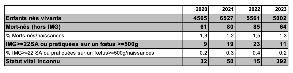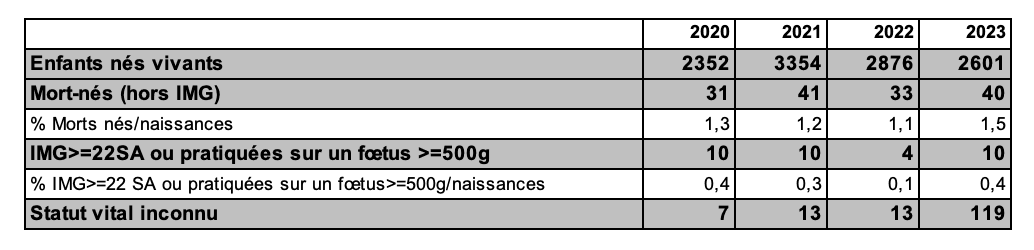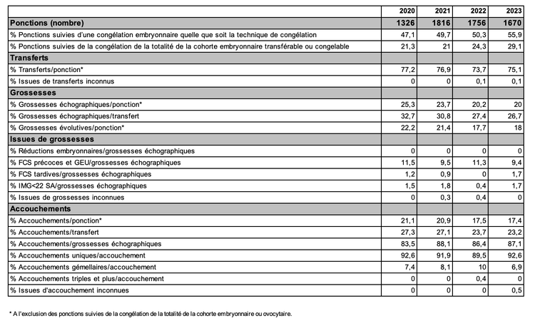 Tableau AMP35. TEC avec ovocytes et spermatozoïdes du couple : issues d'accouchements de 2020 à 2023