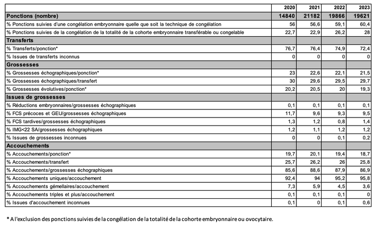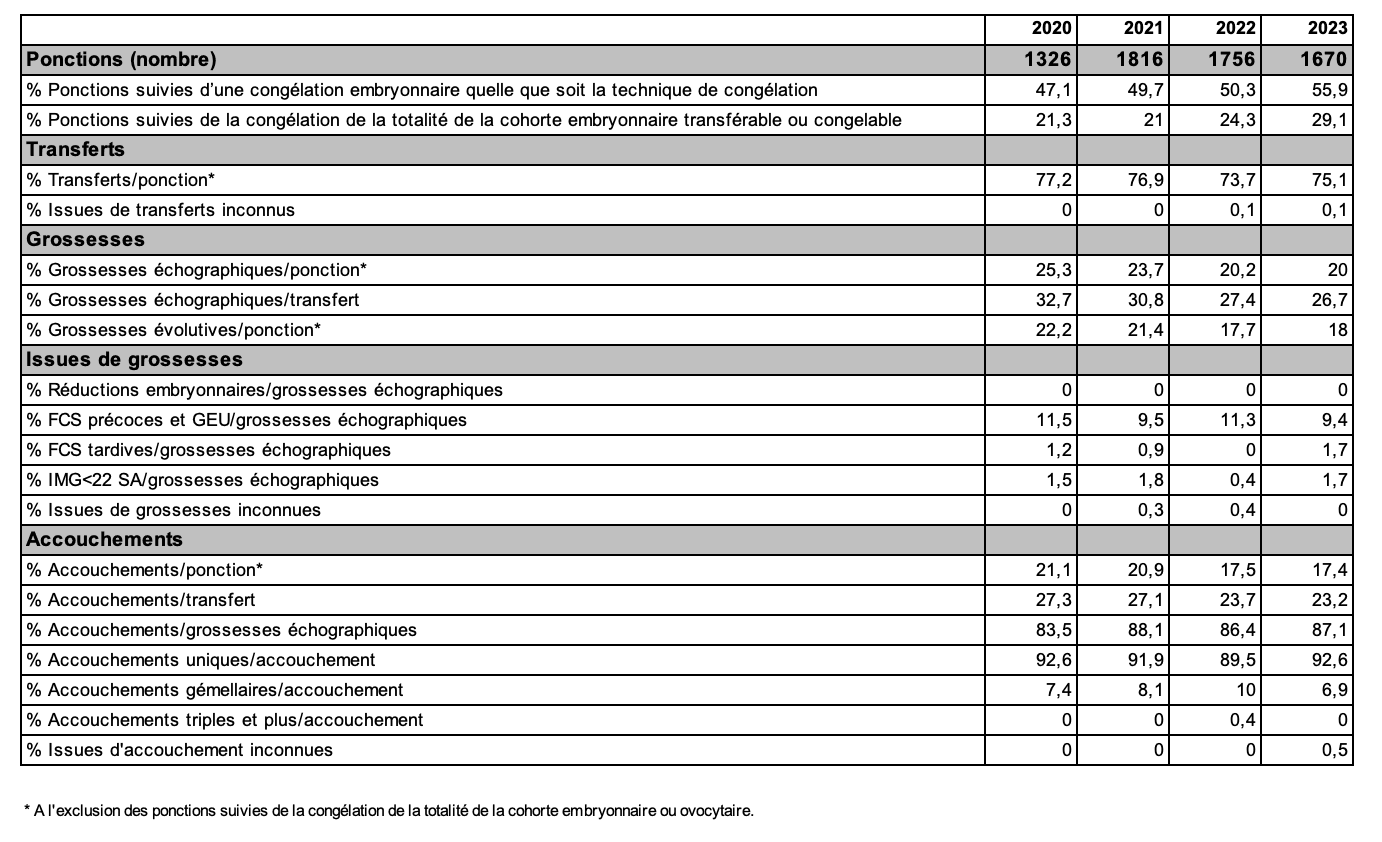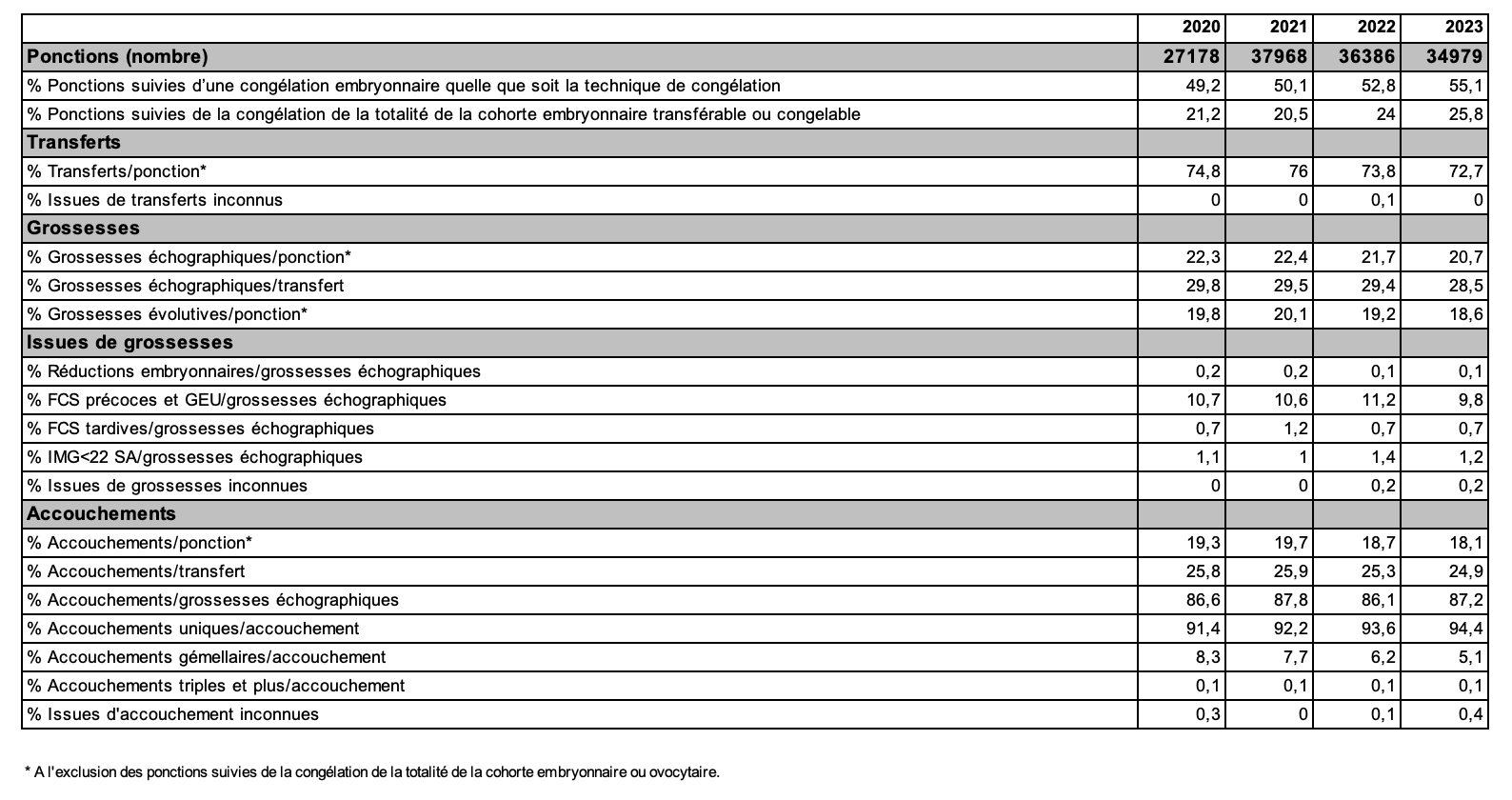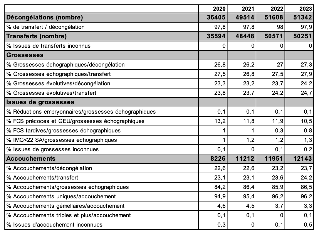 En 2023, le transfert mono-embryonnaire représente 82,82 % des transferts d’embryons frais (tableau AMP14). Ces transferts souvent sélectifs, en augmentation constante (68,91 % en 2020), ont conduit à une diminution du taux d’accouchements multiples (3,6 % en 2023 vs 7,4 en 2020, tableau AMP13). Le taux d’accouchement par ponction FIV hors ICSI baisse progressivement depuis 2021, passant de 20,1% à 19,4% puis à 18,7 % en 2023 avec néanmoins un maintien du taux d’accouchement par transfert à 25,8 % en 2023 (tableau AMP13). La diminution des taux d’accouchement par ponction est à investiguer davantage car ils suggèrent que les femmes prises en charge auraient un moins bon pronostic, ce qui pourrait être dû à l’augmentation de l’âge de prise en charge ou du recours plus fréquent au freeze-all pour les femmes jeunes dont les résultats se retrouvent ainsi exclus du taux d’accouchement par ponction. Cependant, lorsqu’on analyse les taux de grossesse cumulés, ils augmentent chaque année et étaient de 30 % en 2022 (Rapport d’évaluation national).