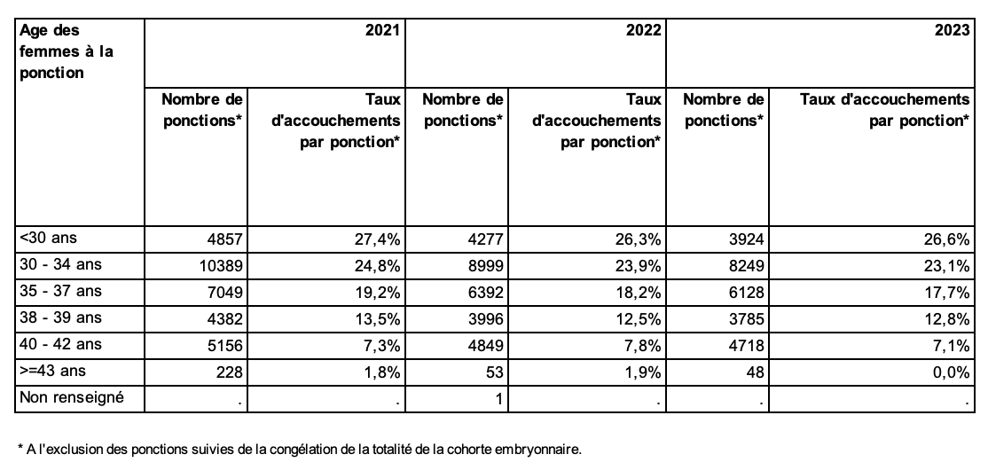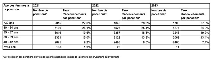 Tableau AMP17. FIV hors ICSI avec ovocytes et spermatozoïdes du couple : taux d'accouchements par ponction de 2020 à 2023 selon l'âge des femmes à la ponction