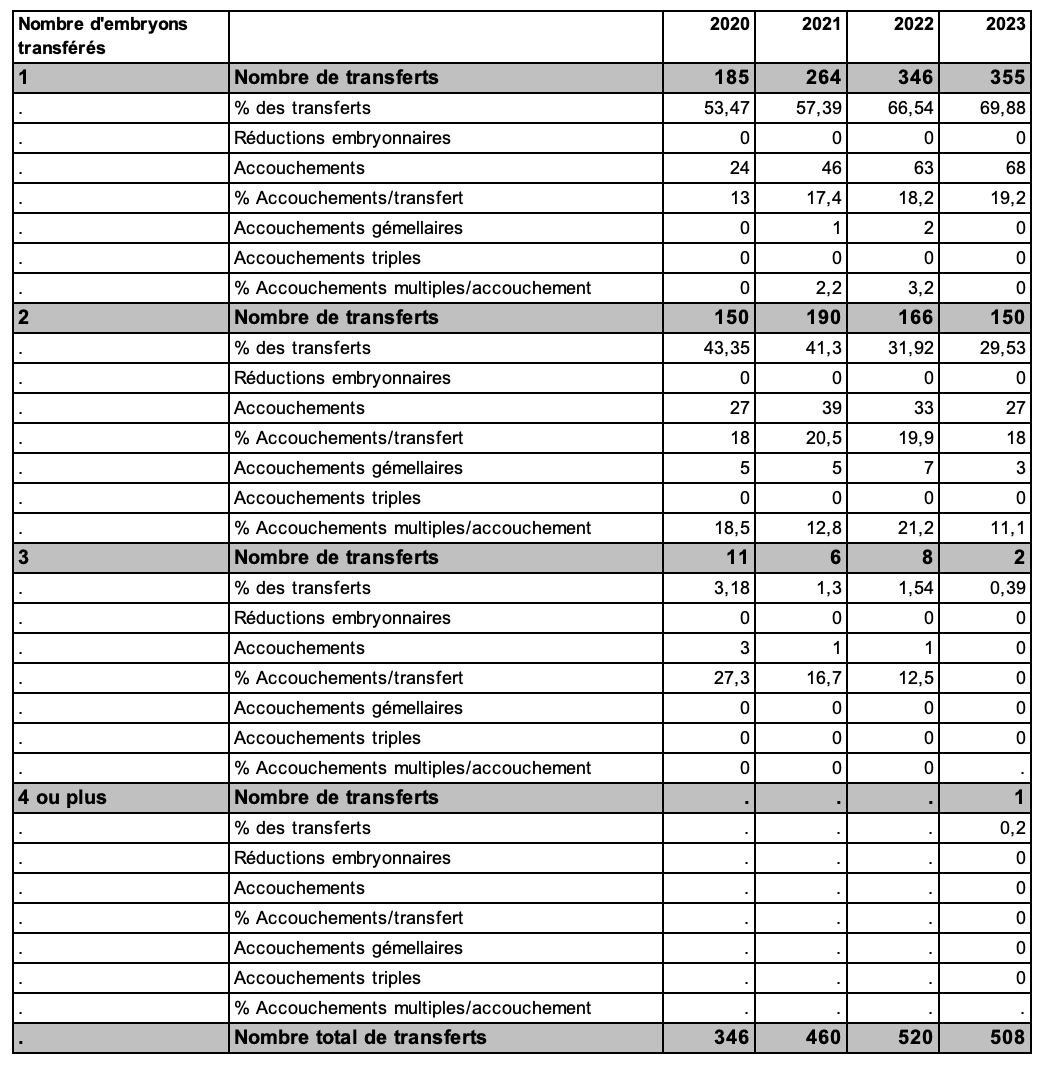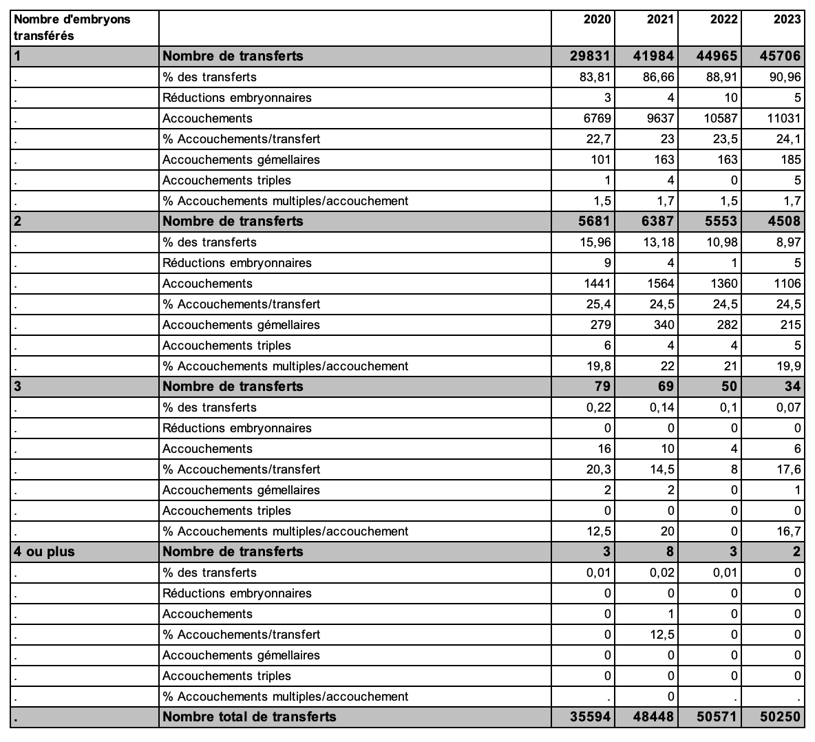 La stratégie de transfert unique est majoritaire : le transfert mono embryonnaire représente 90,96 % des transferts d’embryons congelés de 2023 (tableau AMP33), et le taux de grossesses multiples est inférieur à 4 % (tableau AMP32).