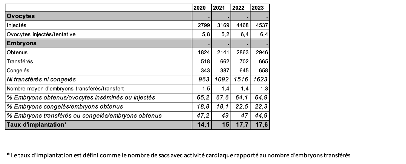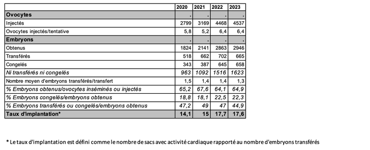 En 2023, le taux de fécondation reste stable à 59,6 % lors de la mise en fécondation par rapport au nombre d’ovocytes inséminés avec une augmentation du taux d’implantation suite à un transfert frais à 26 % en 2023 contre 25,2% en 2022 (Tableau AMP15).