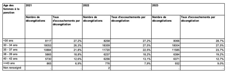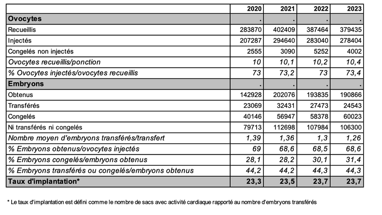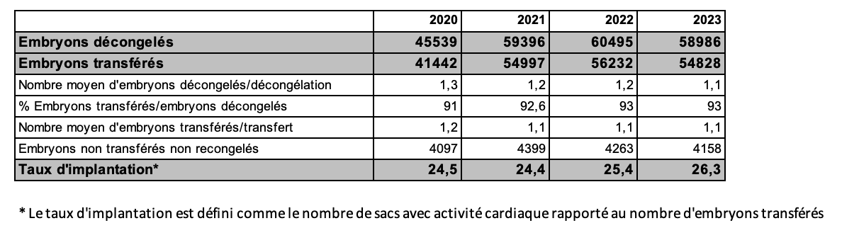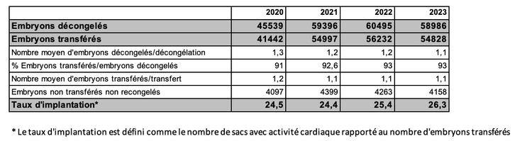 Le taux d’implantation par embryon transféré se stabilise à 17,6 % en 2023 (tableau AMP30) mais reste inférieur à celui des embryons obtenus à partir d’ovocytes frais (26 % et 23,7 % respectivement en FIV et en ICSI intraconjugal) et la possibilité d’un transfert n’est pas garantie, seules 71,3 % des tentatives de décongélations ovocytaires aboutissent à la réalisation du transfert d’au moins un embryon avec une moyenne d’ovocytes décongelés de 6,4 par tentative (tableau AMP28, tableau AMP30).