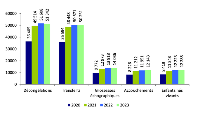 Figure AMP24. TEC en intraconjugal : décongélations, transferts, grossesses, accouchements et enfants nés vivants de 2020 à 2023