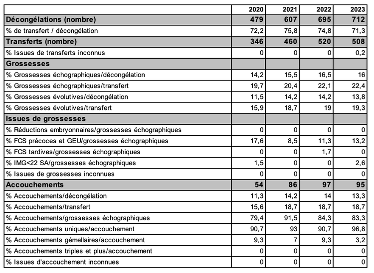 L’indicateur « accouchement par décongélation » est à 13,3 % en 2023 et suit au cours des dernières années des variations à la marge : 14,2 % en 2021 et 14,0 % en 2022.