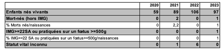 Tableau AMP36. TEC avec ovocytes et spermatozoïdes du couple : issues d'accouchements de 2020 à 2023