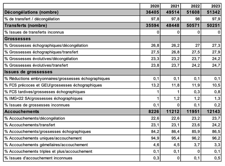 Les taux d’accouchement par cycle de décongélation continuent d’augmenter 23,7 % en 2023 probablement en lien avec la pratique de la culture prolongée (85,9 % des TEC en 2023 versus 75,1 % en 2020, tableau AMP92) et à la sélection des bonnes répondeuses, pour lesquelles le recours au transfert différé après congélation de toute la cohorte fait partie des bonnes pratiques. Par ailleurs, le taux des arrêts précoces du développement embryonnaire continue de diminuer 10,5 % en 2023 versus 13,2 % en 2020 (tableau AMP32). Enfin, l’analyse des protocoles de préparation endométriale n’est pas possible en exhaustivité mais a un probable impact sur les taux d’accouchement. Ainsi, il serait intéressant de pouvoir analyser les résultats en fonction des protocoles de préparation endométriale.