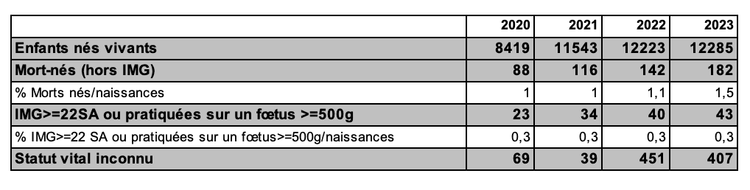 Le suivi des grossesses de 2023 montre que 10,1 % des grossesses obtenues s’interrompent au premier trimestre par une fausse couche (FC) ou une grossesse extra-utérine (GEU) (tableau AMP9), ce chiffre étant en continuelle diminution depuis 2020 (tableau AMP9). En conséquence les cycles d’insémination de 2023, ont permis la naissance de 4 062 enfants vivants.