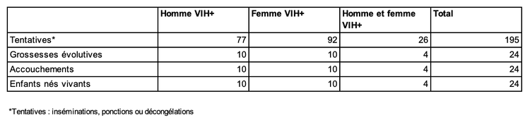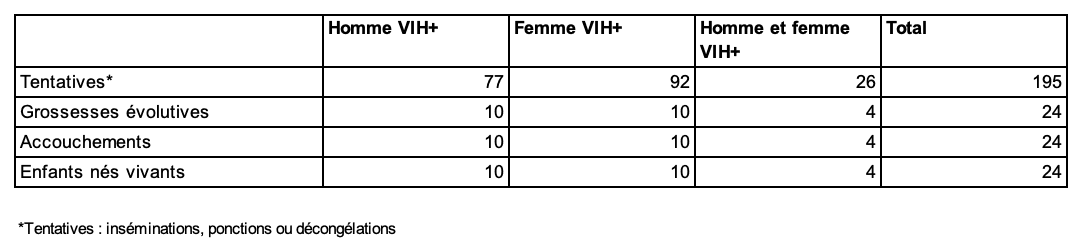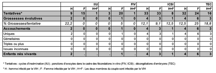 Rapportée à l’ensemble des tentatives d’AMP réalisées par les centres d’AMP, l’activité de fécondation in vitro dans le contexte VIH diminue. Cette baisse s’explique par la mise en place de nouvelles thérapeutiques entrainant la négativation prolongée de la charge virale chez les patients traités. L’AMP est dorénavant plus souvent proposée pour répondre à un problème d’infertilité que pour éviter le risque de transmission virale au conjoint ou à l’enfant.