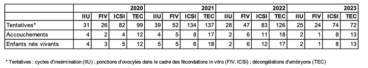 Les centres d’AMP ont déclaré en 2023 195 tentatives d’AMP toutes techniques confondues pour les patients infectés par le VIH (Tableau AMP113). Le taux d’accouchement par tentative était de 12,3 % (24 enfants).