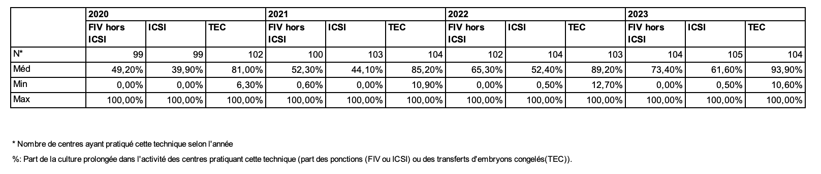 Le recours à la culture prolongée est en constante augmentation. Ainsi en 2023, la culture prolongée est mise en œuvre dans 57,9 % des ponctions en vue de FIV, 51 % des ponctions en vue d’ICSI et 85,9 % des transferts d’embryons congelés (contre respectivement en 2022, 52,9%, 46,4% et 80,5 %, Tableau AMP92). Toutefois, selon les centres, le recours à cette technique varie (Tableau AMP93). Les pratiques de culture prolongée sont très hétérogènes, pouvant intéresser l’ensemble de la cohorte embryonnaire ou, dans certains centres, seulement une partie des embryons (embryons surnuméraires après un transfert précoce, embryons conservés au stade précoce et remis en culture après leur décongélation en vue d’un transfert de blastocyste). Cette hétérogénéité des pratiques gêne l’interprétation des données d’activité.