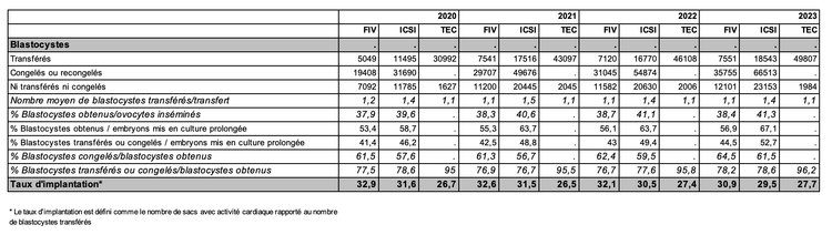 Les taux d’implantation par blastocyste transféré sont de 30,9 % après FIV, 29,5 % après ICSI et 27,7 % après TEC. Ce taux est donc plus bas après décongélation d’embryon qu’après un transfert d’embryon frais. Ceci suggère que la capacité des blastocystes à s’implanter pourrait être altérée par la congélation (diminution de la qualité des blastocystes). Néanmoins, si le taux d’implantation post-décongélation est plus bas que dans les autres techniques, celui-ci s’améliore de 2020 à 2023 (26,7% en 2020 contre 27,7% en 2023) (Tableau AMP95).