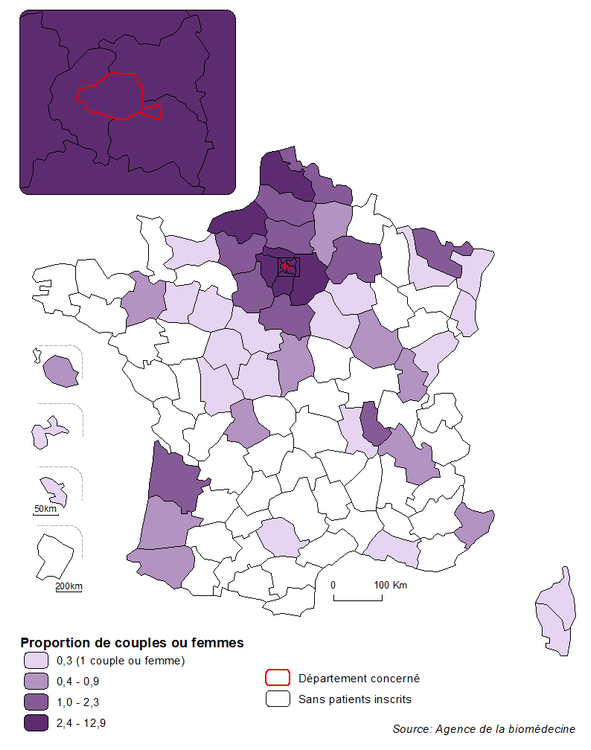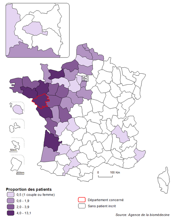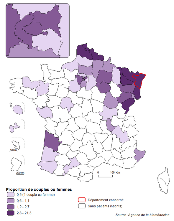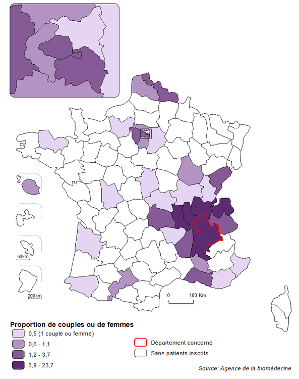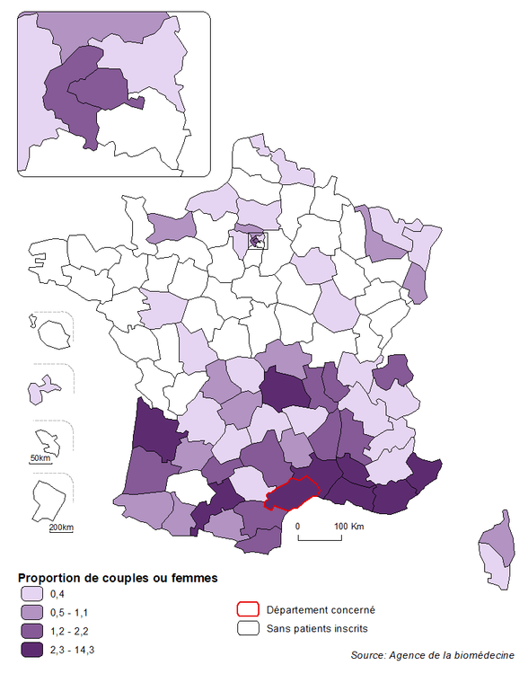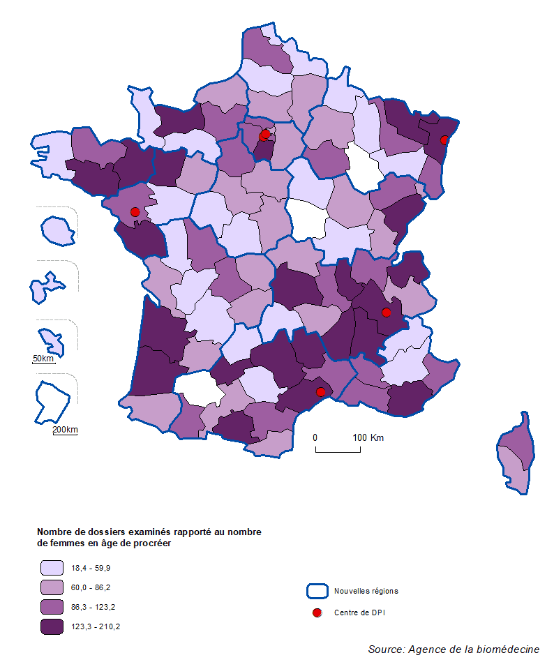 En considérant le recrutement de chaque centre de DPI, la distribution semble relativement équilibrée entre les centres et globalement corrélée au lieu de résidence des couples. Parmi les départements situés à distance d’un centre de DPI, des demandes émanant de couples résidant en Nouvelle Aquitaine ou dans le Nord, départements parmi les plus peuplés de France, ou encore dans le Limousin, sont particulièrement représentées (Figure DPI3).
