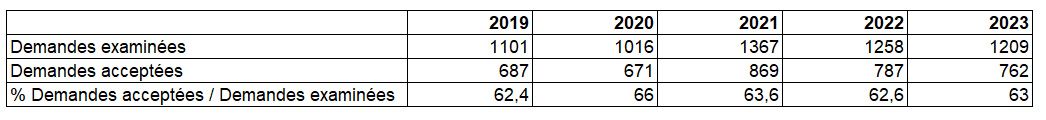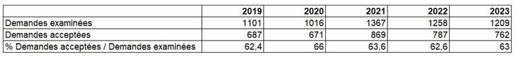 Tableau DPI5. Evolution de la fréquence des demandes acceptées par rapport aux demandes examinées de 2019 à 2023