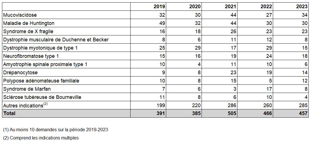 Tableau DPI9. Evolution du nombre de demandes acceptées en génétique moléculaire pour les indications les plus fréquentes(1) de 2019 à 2023