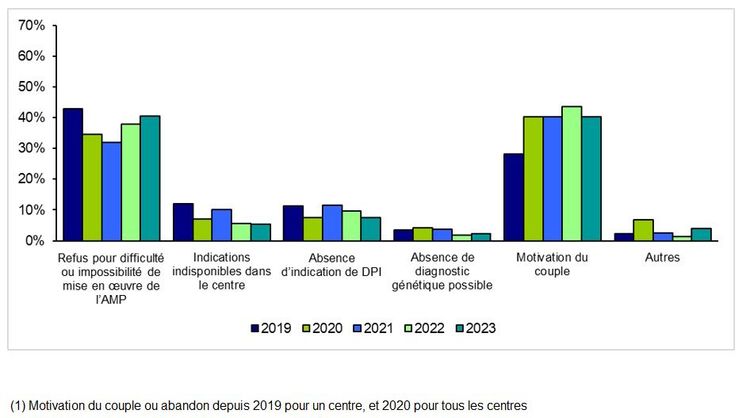 Parmi les motifs de refus en 2023 (Figure DPI1), un abandon de la demande ou une absence de « motivation du couple » est une des causes principales de non réalisation d’un DPI, à équivalence avec la difficulté ou l’impossibilité à mettre en œuvre l’AMP (40,5 %), causée par exemple par une insuffisance de la réserve ovarienne.