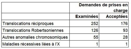 La répartition par indication des demandes examinées en cytogénétique est présentée dans le Tableau DPI8, montrant qu’une seule demande avec une maladie récessive liée à l’X impliquant un sexage a été faite et acceptée. Concernant les translocations, le taux d’acceptation des demandes pour les translocations robertsoniennes (73,8 %, 93 demandes acceptées sur 126 examinées) est légèrement plus important que pour les translocations réciproques (69,8%, 176 demandes acceptées sur 252 examinées) ou pour les autres anomalies chromosomiques (50,9 %, 28 demandes acceptées pour 55 demandes), souvent plus complexes.