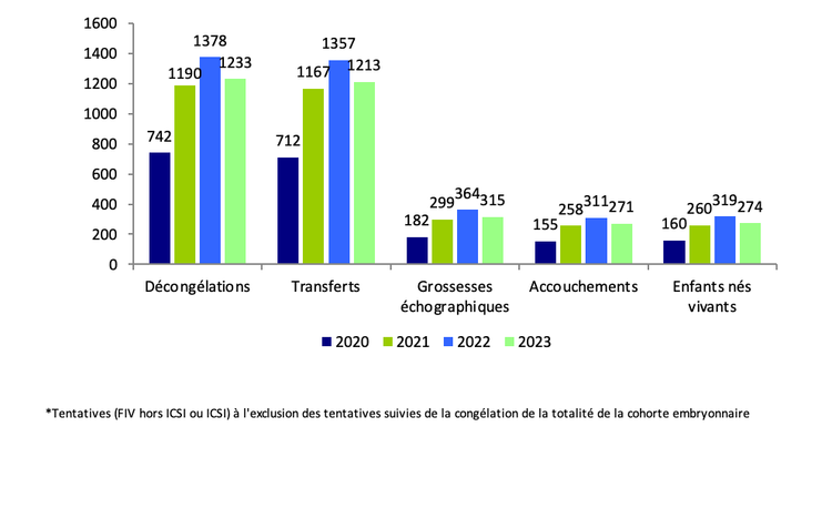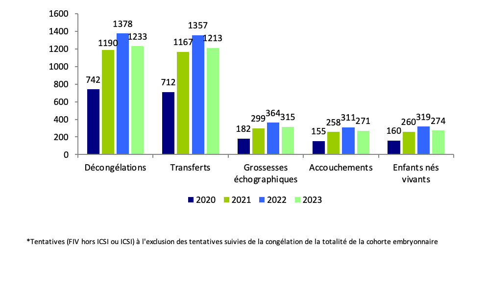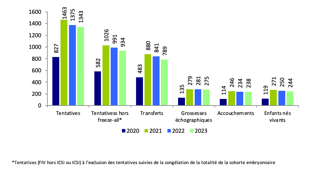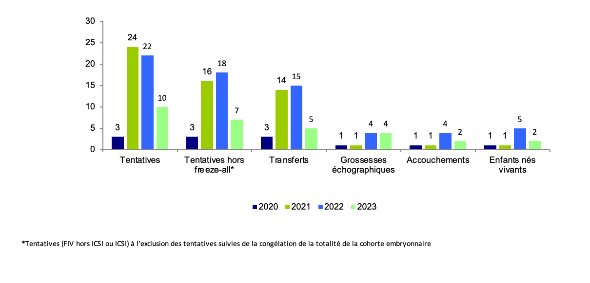 Les 2 586 tentatives réalisées en 2023 ont permis la naissance de 520 enfants (Figures AMP27, AMP28 et AMP29, et tableau AMP40).