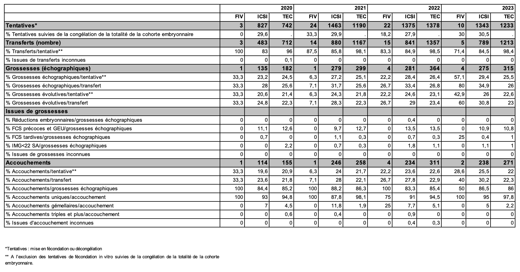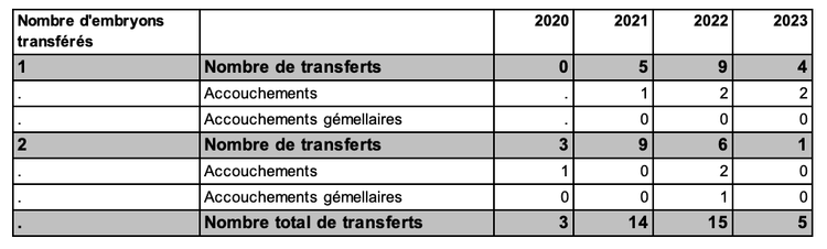 Tableau AMP42. ICSI avec don d'ovocytes : nombre d'embryons transférés et accouchements de 2020 à 2023