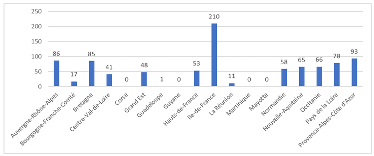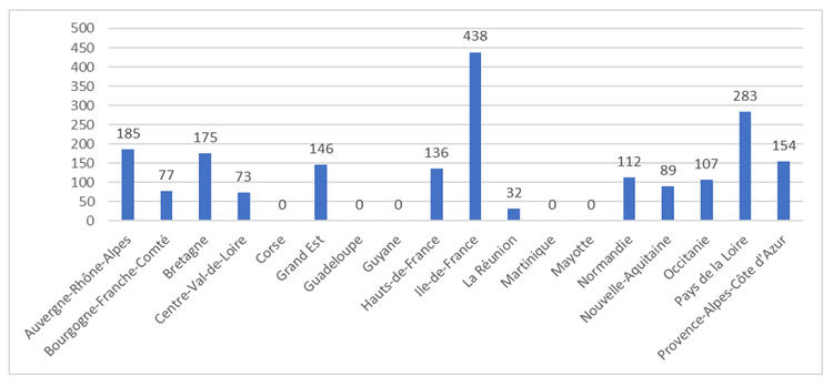 Les 36 centres actifs répartis dans 13 régions et autorisés[1] pour l’activité de don d’ovocytes ont effectué 912 prélèvements d’ovocytes qui ont abouti à un don en 2023. Ces dons se répartissent de la manière suivante :
