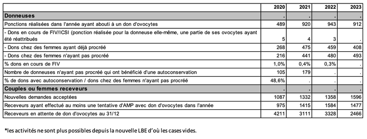 Le nombre de prélèvements d’ovocytes en vue de don de 2023 a diminué de 3,2 % par rapport à 2022 (912 en 2023 versus 943 en 2022, tableau AMP37). Si l’on compare aux données antérieures à la crise sanitaire de 2020, ce chiffre est supérieur de 9,2 % au nombre de donneuses de 2019 (835 donneuses en 2019) confirmant l’évolution favorable du nombre de donneuses.