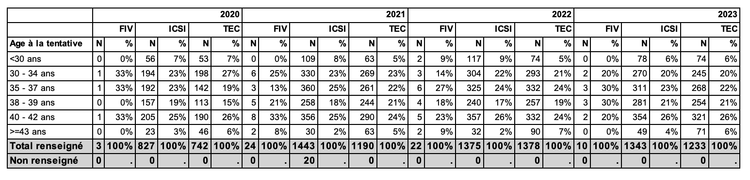 Tableau AMP39. AMP avec don d'ovocytes : répartition de l'âge des femmes à la tentative de 2020 à 2023