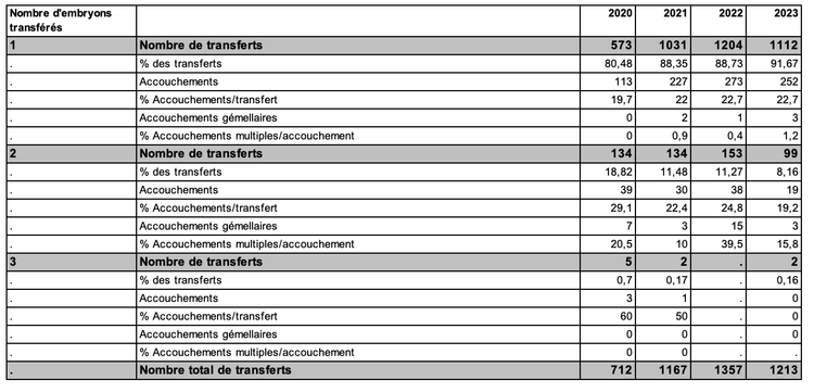 Une augmentation des chances de procréer après transfert d’embryon frais (ICSI : en 2023, 25,5 % d’accouchements par tentative contre 23,2 % en 2022, tableau AMP40). Une hausse des taux d’implantation (31,1 % en 2023 contre 28,1 % en 2022, tableau AMP43) permet le maintien des chances de procréer, en parallèle de l’augmentation qui se poursuit en 2023 de la part des transferts mono-embryonnaires (2023 : 83,8 % ; 2022 : 70,27 %).