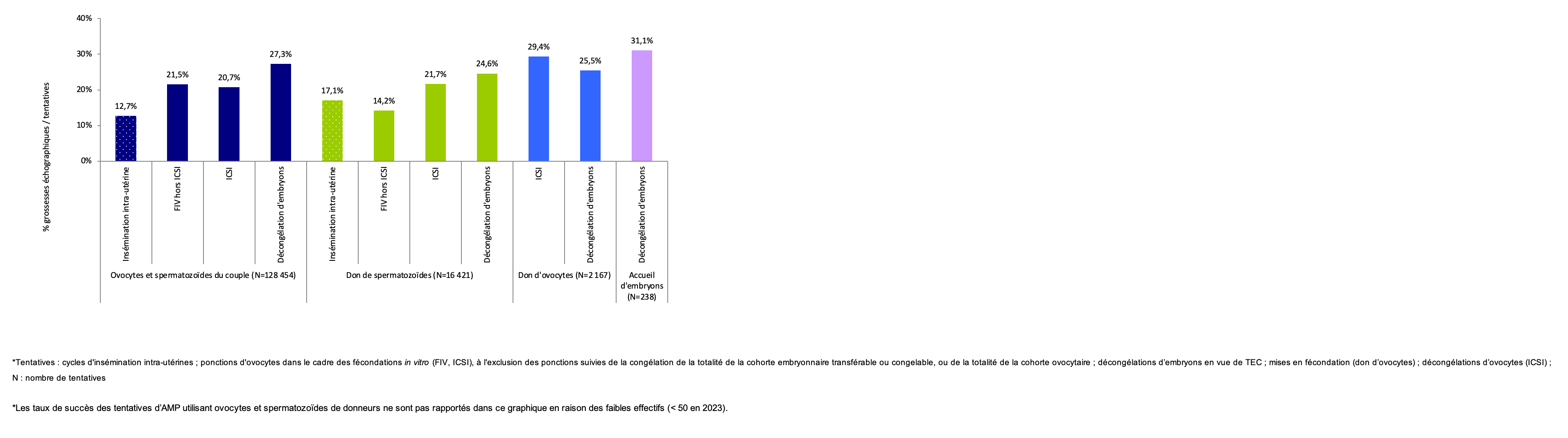 Figure AMP10. Taux de grossesses échographiques par tentative* d'AMP selon le type d'AMP et l'origine des gamètes en 2023