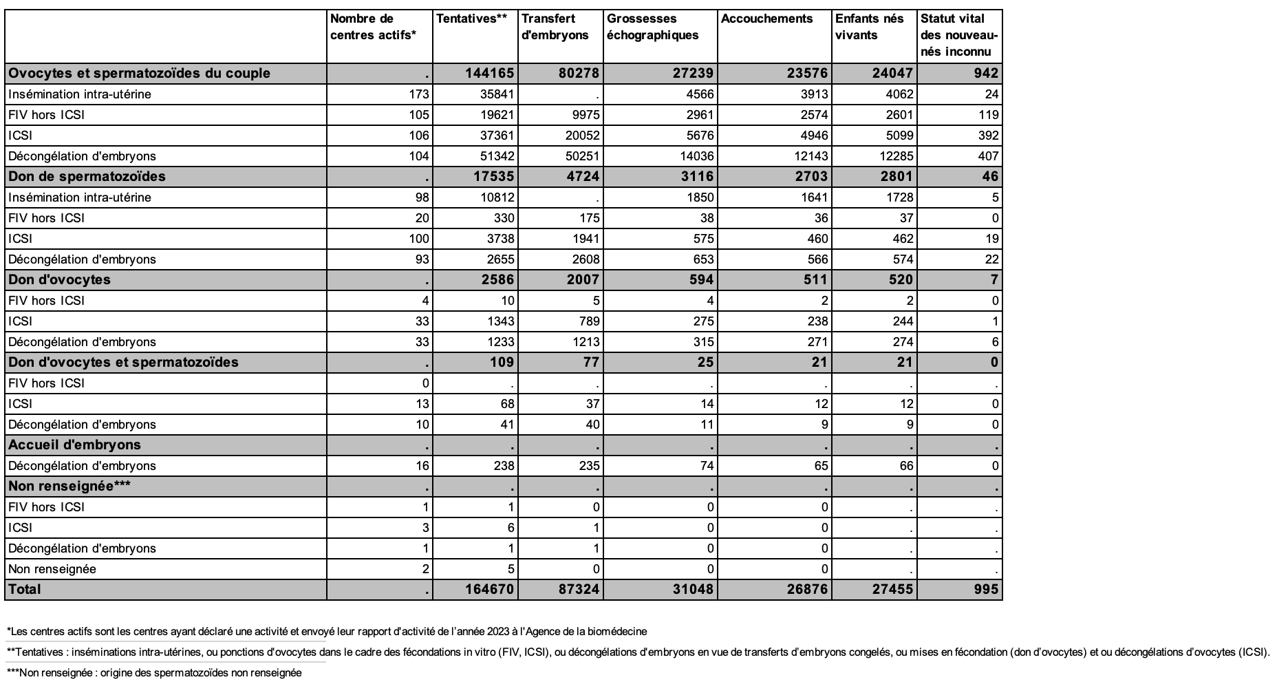 En 2023, le volume d’activité d’AMP a augmenté en raison des nouveaux droits permis par la loi de bioéthique de 2021:164 670 tentatives d’AMP (+ 3,1% par rapport à 2022) ont été recensées, regroupant des inséminations intra-utérines (IIU), des fécondations in vitro (FIV) avec ou sans micro-injection (ICSI) et des décongélations d’embryons congelés[3] avec gamètes et embryons issus ou non d’un don de gamètes ou d’un accueil d’embryons (tableau AMP1, tableau AMP3) ; les activités de conservations de gamètes dans un cadre médical ou non médical ont augmenté de 25 % (18 209 personnes ont bénéficié d’une conservation en 2023, dont 79 % pour motif médical).
