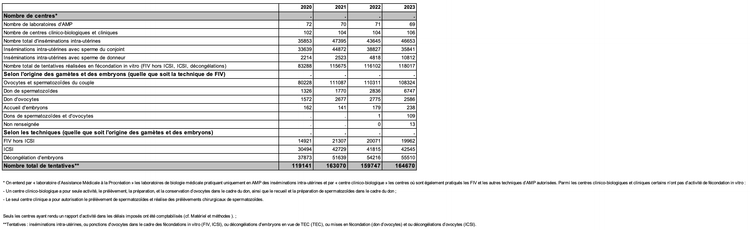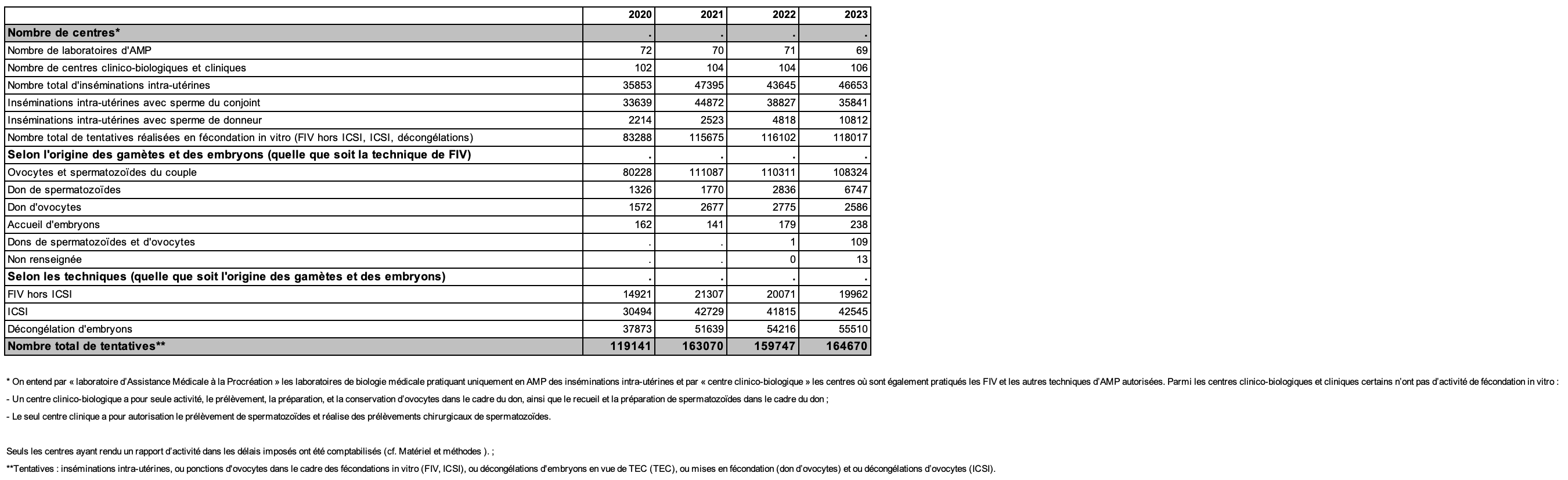 En 2023, le volume global des activités d’AMP a augmenté tant pour répondre aux demandes de projet immédiat d’enfants, ou de conservation de gamètes et tissus germinaux en vue de projet différé (+ 3,1 % de tentatives, + 25 % de conservation de gamètes par rapport à 2022). Etant donné la pandémie de SARS-COV2, l’année 2020 a été singulière, les centres d’AMP ont connu une période d’arrêt suite aux recommandations de l’Agence de la biomédecine de report des activités cliniques et biologiques entre le 25 mars et le 13 mai 2020, entrainant une baisse d’activité, puis ont rattrapé le retard accumulé au cours de l’année 2021.