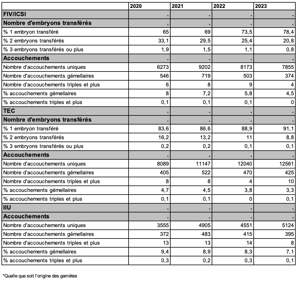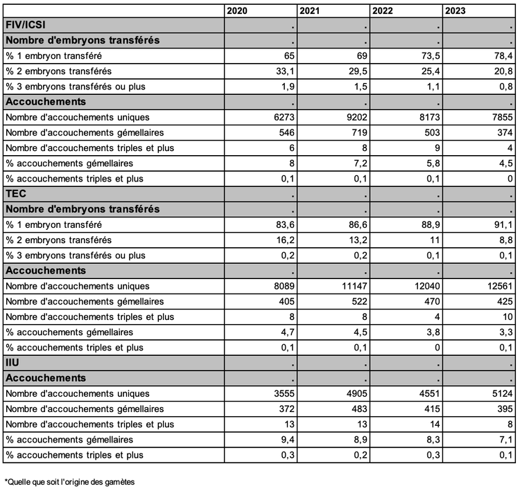 Tableau AMP4. Nombre d'embryons transférés et accouchements multiples de 2020 à 2023*