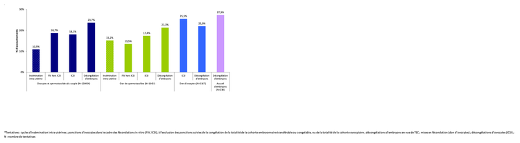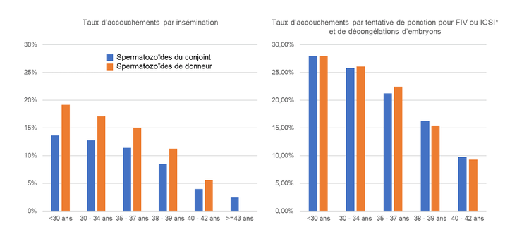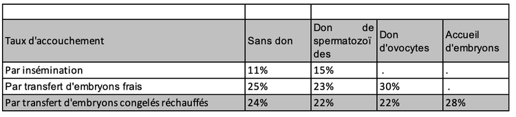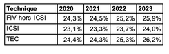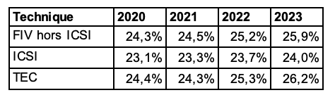 Le taux de succès après insémination avec spermatozoïdes de donneurs qui étaient ces 3 dernières années proche de 20 % diminue depuis 2022 (17 % en 2022, 15,2 % en 2023). Les taux succès en intraconjugal sont quant à eux stables (10 %).