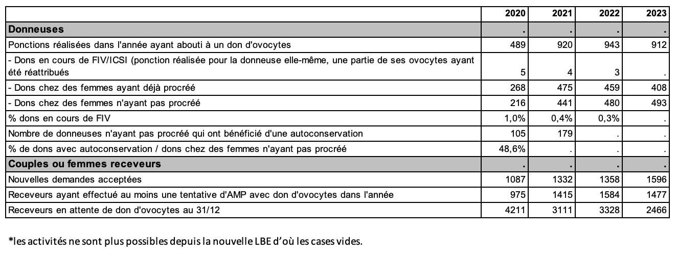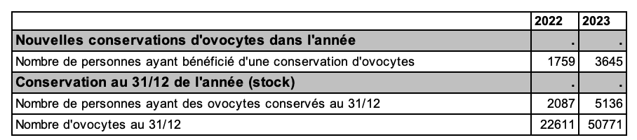 Un droit d’accès à la conservation des ovocytes sans motif médical davantage connu et mis en œuvre par les équipes d’AMP : depuis 2022, date de début de l’autorisation de conservation autologue sans motif médical, près de 5 400 femmes ont pu bénéficier d’une conservation d’ovocytes. Cette activité a doublé entre 2022 et 2023 (1 759 vs 3 645) et représente en 2023, 5 % des ponctions d’ovocytes toutes finalités confondues. Une mesure d’impact de cette disposition législative sera à réaliser dans les années à venir afin d’évaluer le délai avant utilisation, les chances de réussite et la proportion de femmes qui utiliseront leurs ovocytes ou les donneront pour un couple ou une femme en parcours d’AMP.