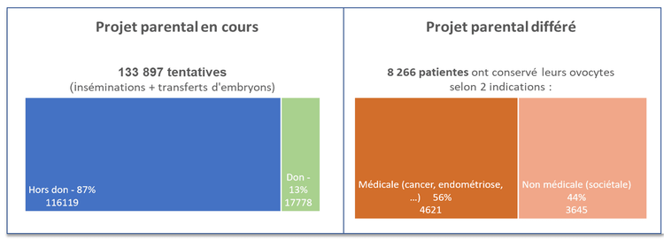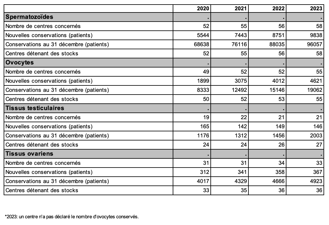 Un meilleur accès à la préservation médicale de la fertilité permis notamment par un nombre croissant de centres autorisés : annuellement le nombre de patients bénéficiant d’une conservation de gamètes en vue d’une préservation médicale de la fertilité visant à donner la possibilité de recourir à une AMP pour un projet parental ultérieur croit, évoquant que le recours à cette possibilité est facilité : 9 838 (7 443 en 2021, + 32 % par rapport à 2021), 4 621 (3 075 en 2021, + 50 %) de personnes ayant respectivement conservé leurs spermatozoïdes et leurs ovocytes.