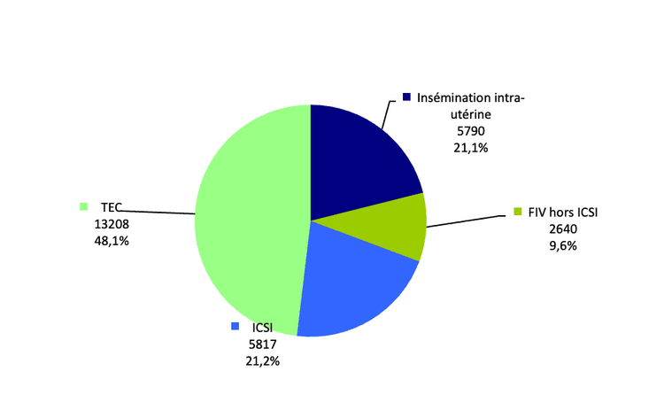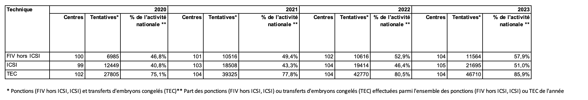 Le recours à l’ICSI, technique pratiquée en fonction des paramètres spermatiques et ovocytaires (lors de vitrification préalable) et afin de minimiser les échecs de fécondation, représente 66,8 % de l’ensemble des tentatives de fécondation in vitro quelle que soit l’origine des gamètes utilisés. Ce chiffre est stable depuis plusieurs années.