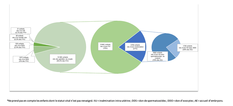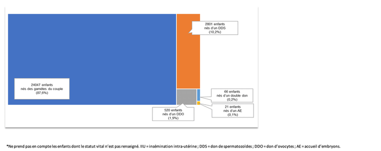 Au total près de 28 440 enfants[4] sont nés d’une AMP réalisée au cours de l’année 2023 (27 700 en 2022, 28 340 en 2021), dont 12,4 % d’enfants issus d’un don (près de 3 460 enfants[5], tableau AMP1). Ces enfants représentent 4 % des enfants nés en France en 2023. On estime que près d’un enfant sur 24 est issu d’une AMP (1/27 en 2022).