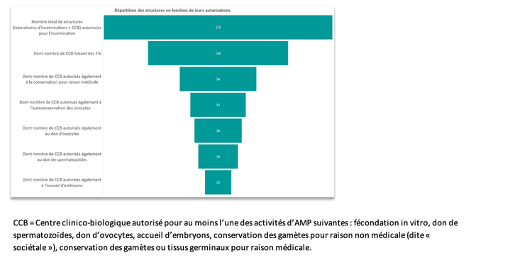 Par exemple, parmi les 106 centres autorisés à réaliser des fécondations in vitro, 58 sont autorisés pour le recueil et la conservation des gamètes et tissus germinaux.