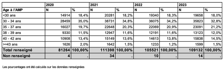 Tableau AMP6. Evolution de l'âge des femmes à l'insémination ou à la ponction en vue de fécondation in vitro de 2020 à 2023, quelle que soit l'origine des gamètes et la technique utilisée