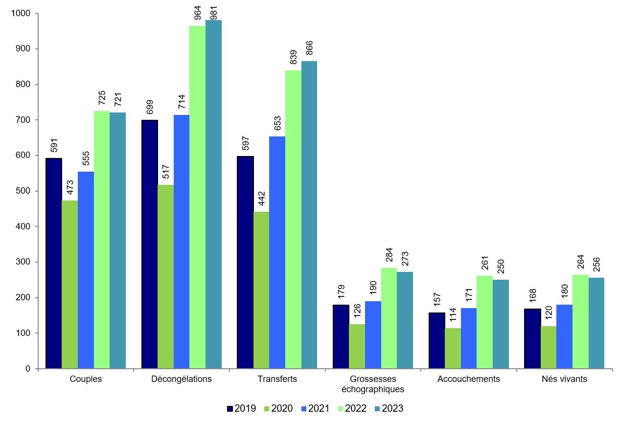 Au total, le nombre de transferts d’embryons congelés augmente annuellement : +3,2 % par rapport à l’année précédente (866 en 2023 vs 839 en 2022) et de 45 % par rapport à l’année de référence 2019 (597 en 2019) (Figure DPI8).